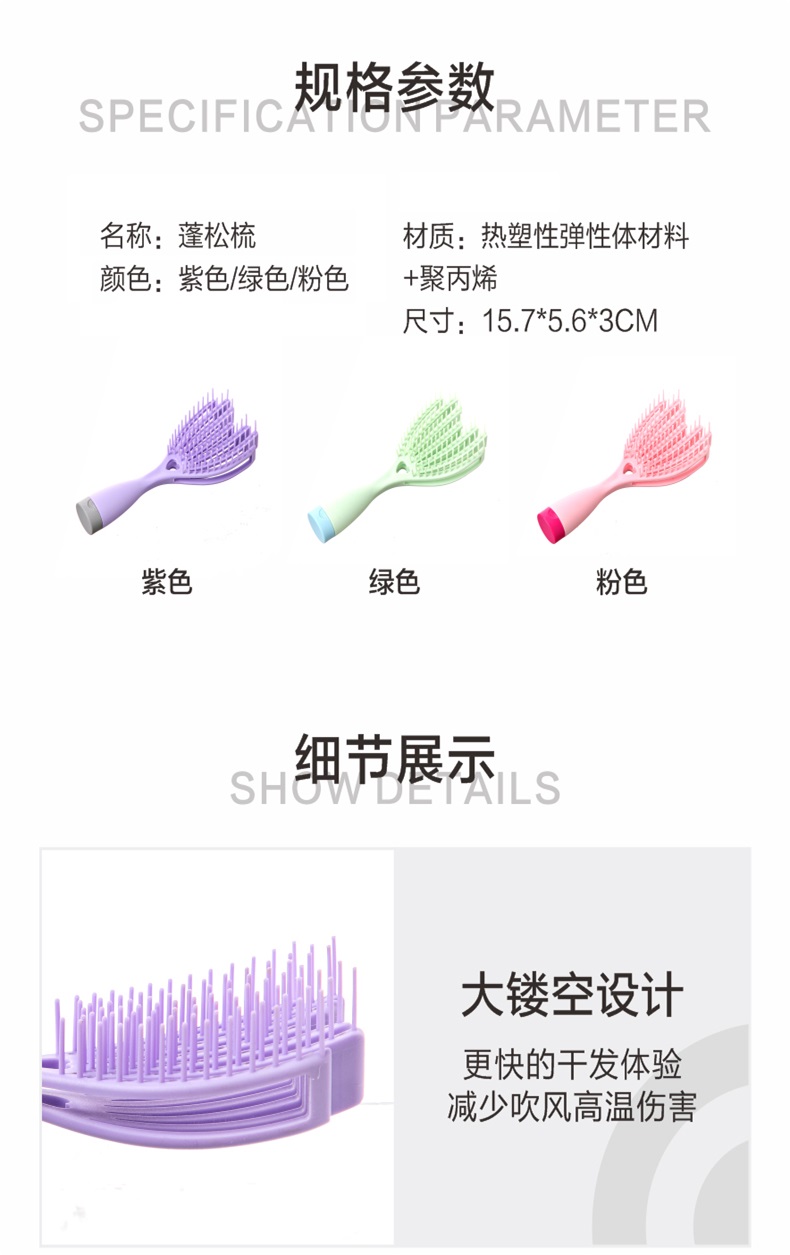 • 商品名称:便携干湿两用镂空顺发按摩蓬松梳--粉色
