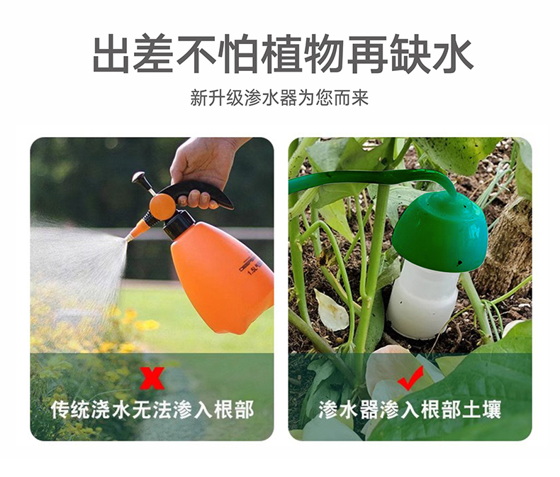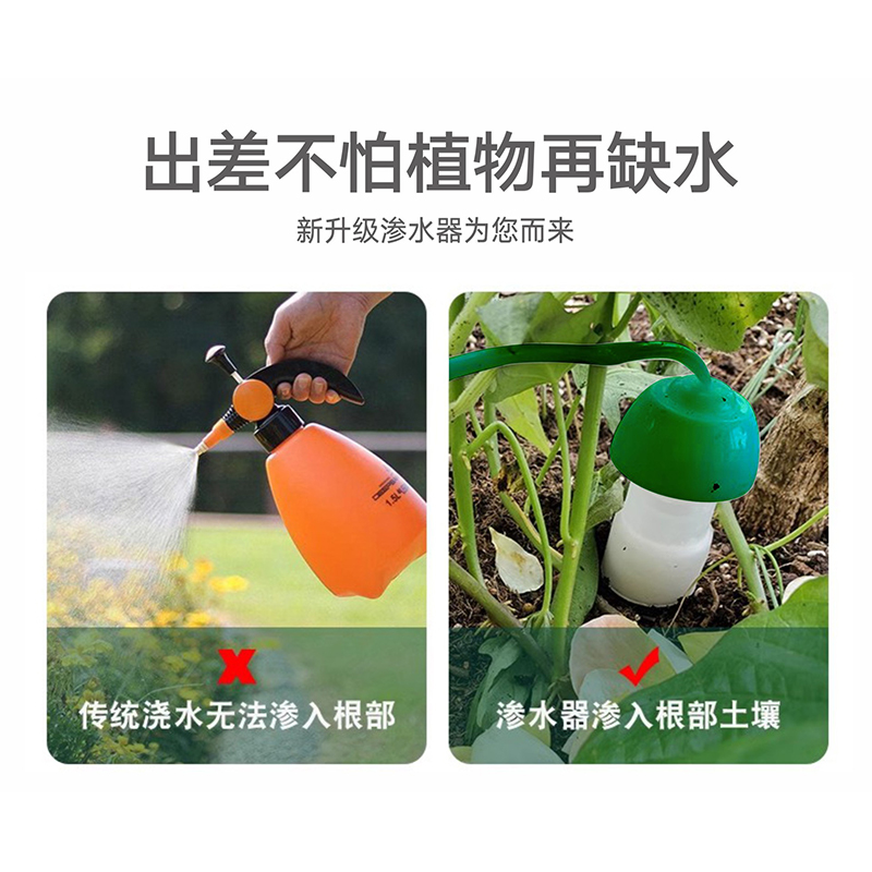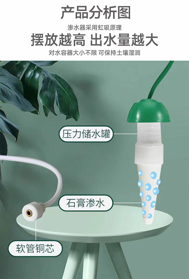 产品特点:一件渗水器解决了每天需给花草或出差在外无人照顾浇水的烦恼,