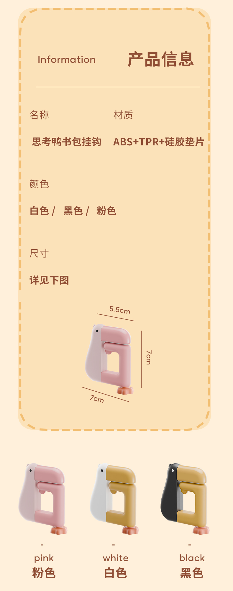 商品名称: 卡通萌趣思考鸭多用书包挂钩 学生课桌书桌边包包挂钩--粉色