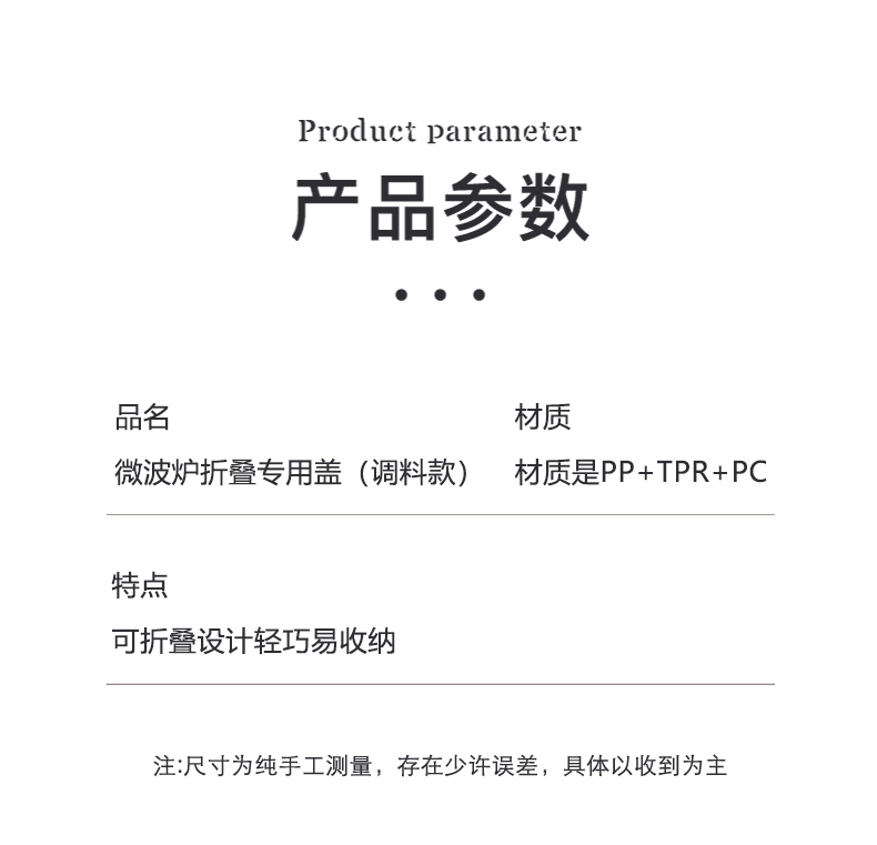 • 商品名称:微波炉折叠专用盖加热防溅盖 防烫手柄保温保鲜带托盘 (调料款)