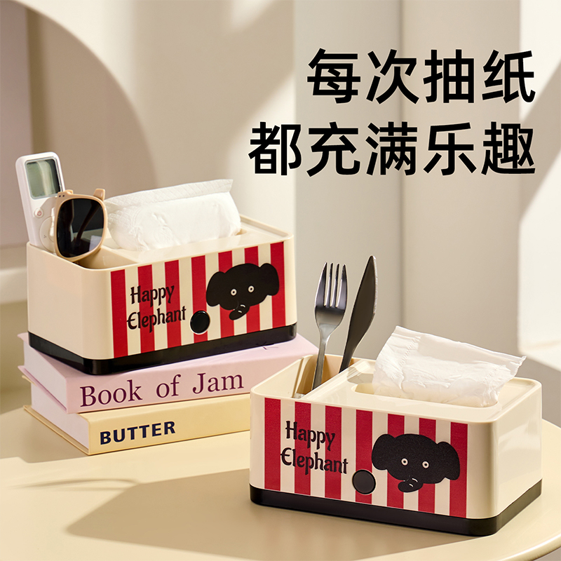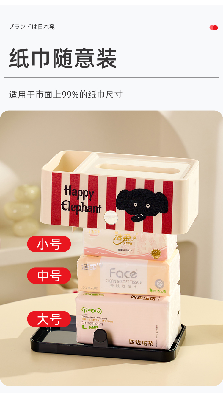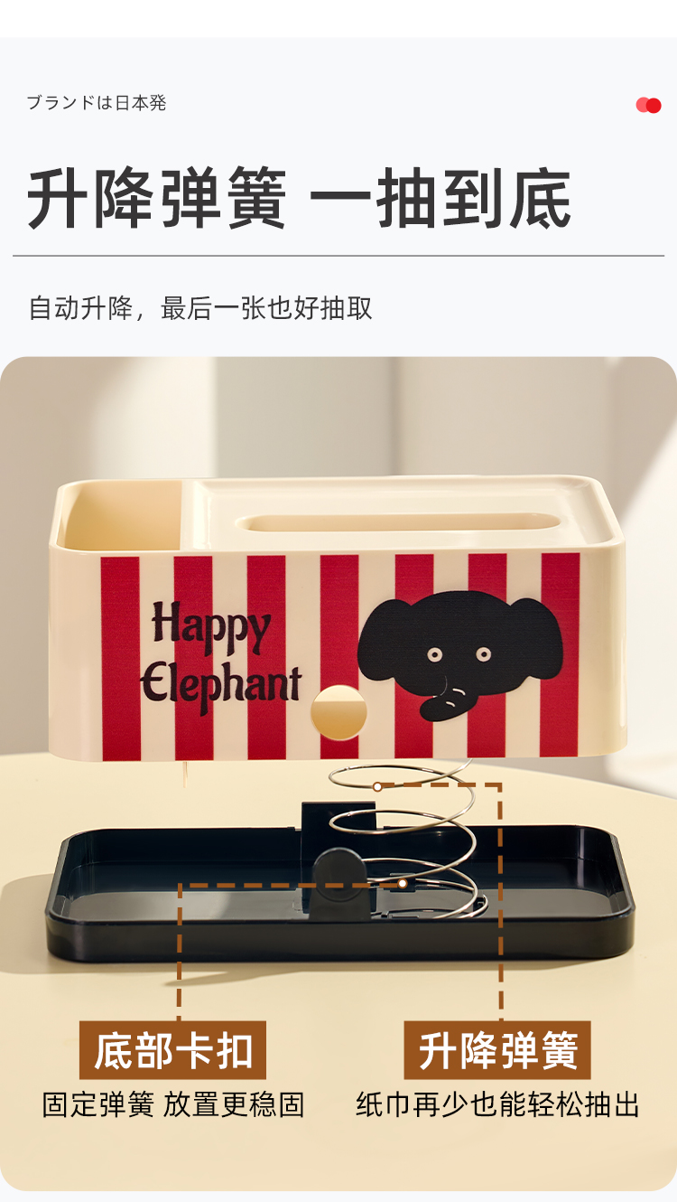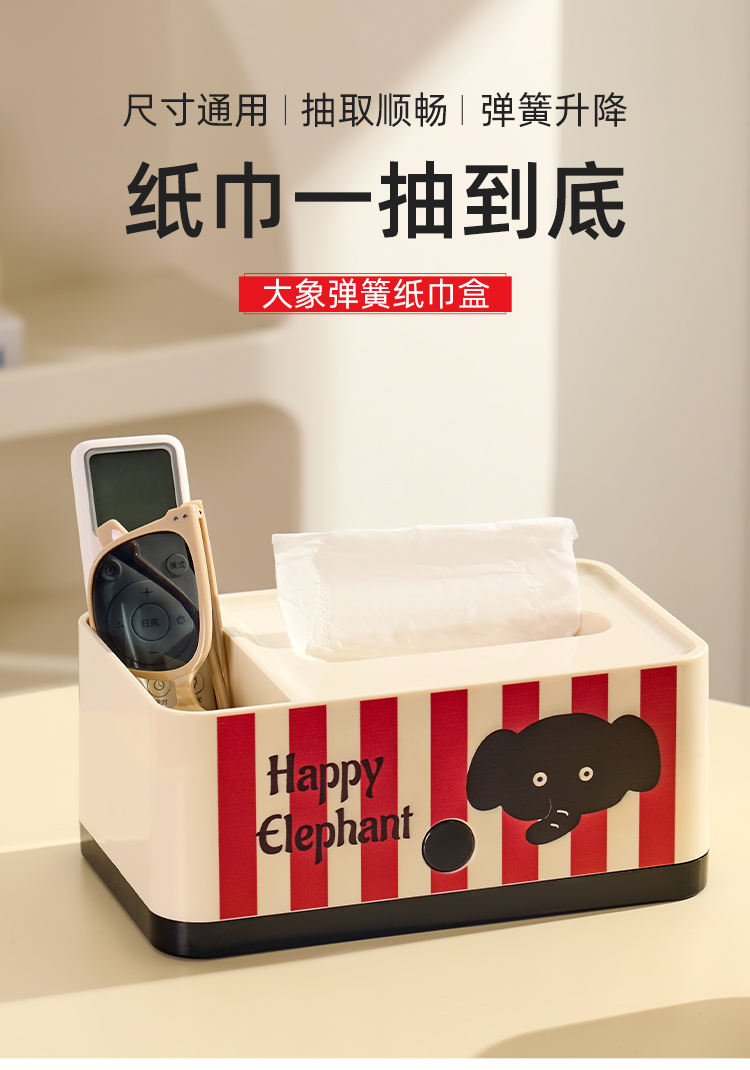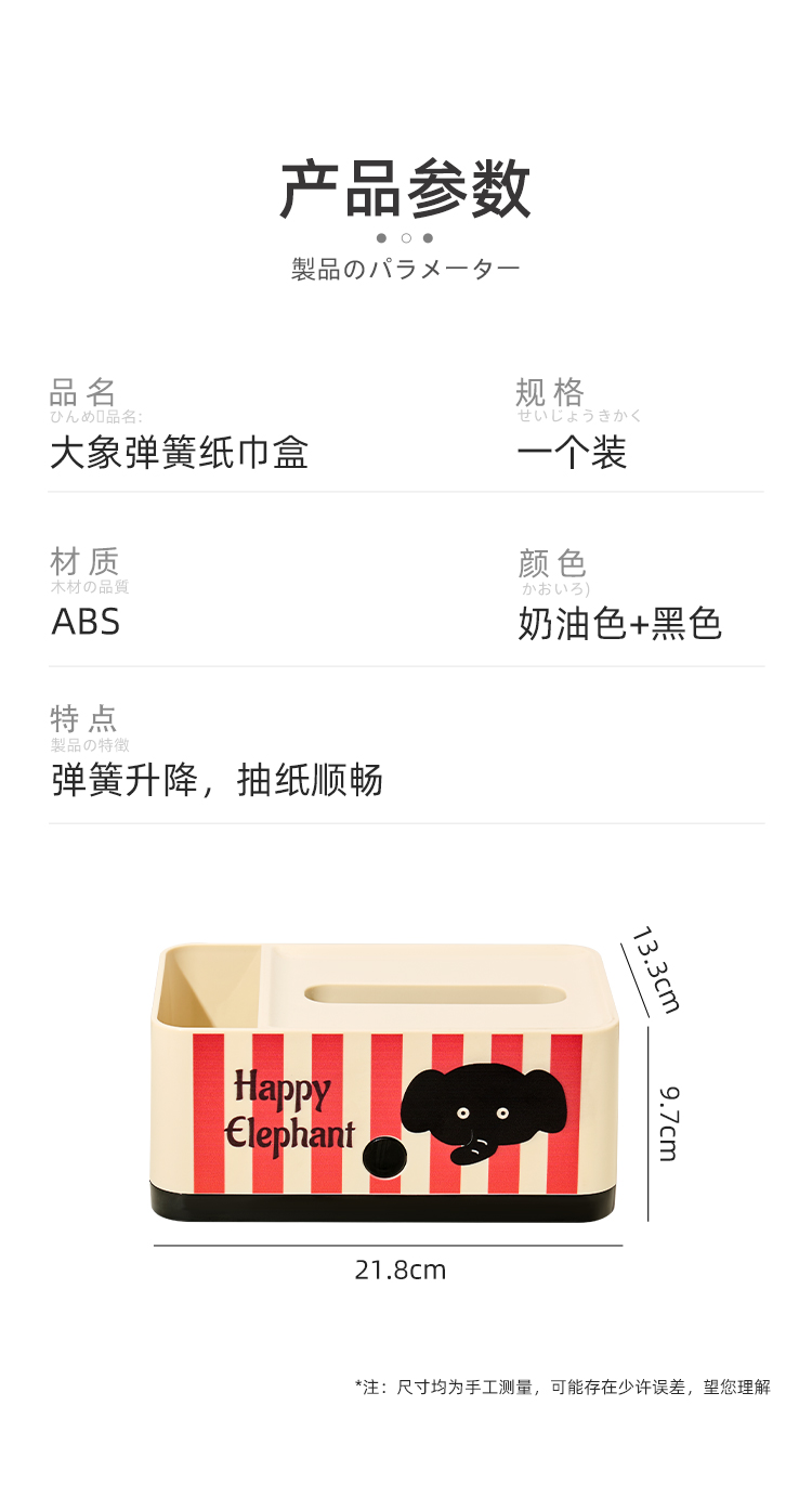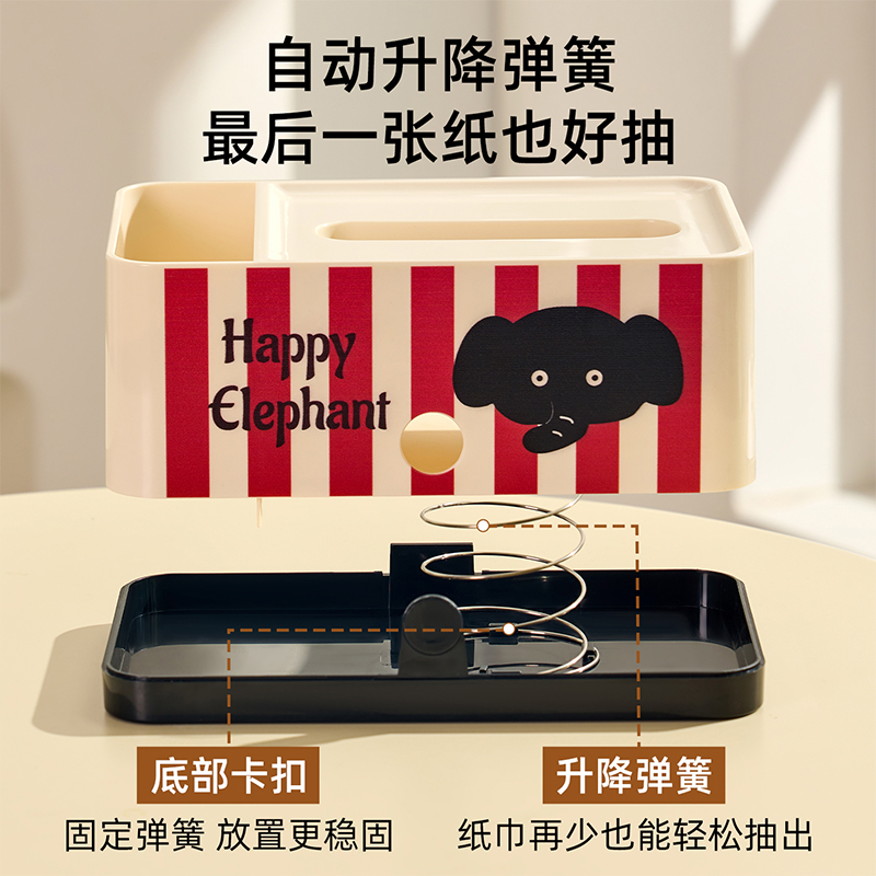 商品名称: 卡通大象弹簧升降纸巾盒 带侧置物格遥控器架--奶油色+黑色
