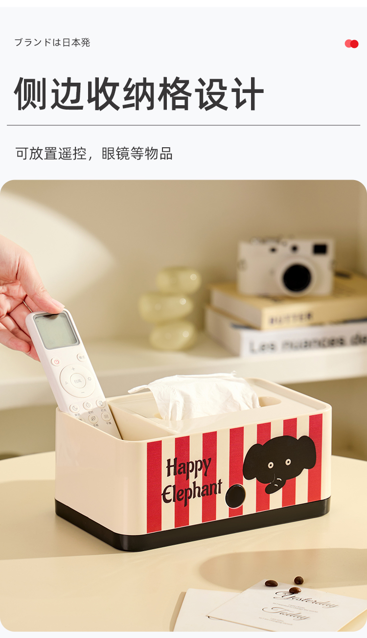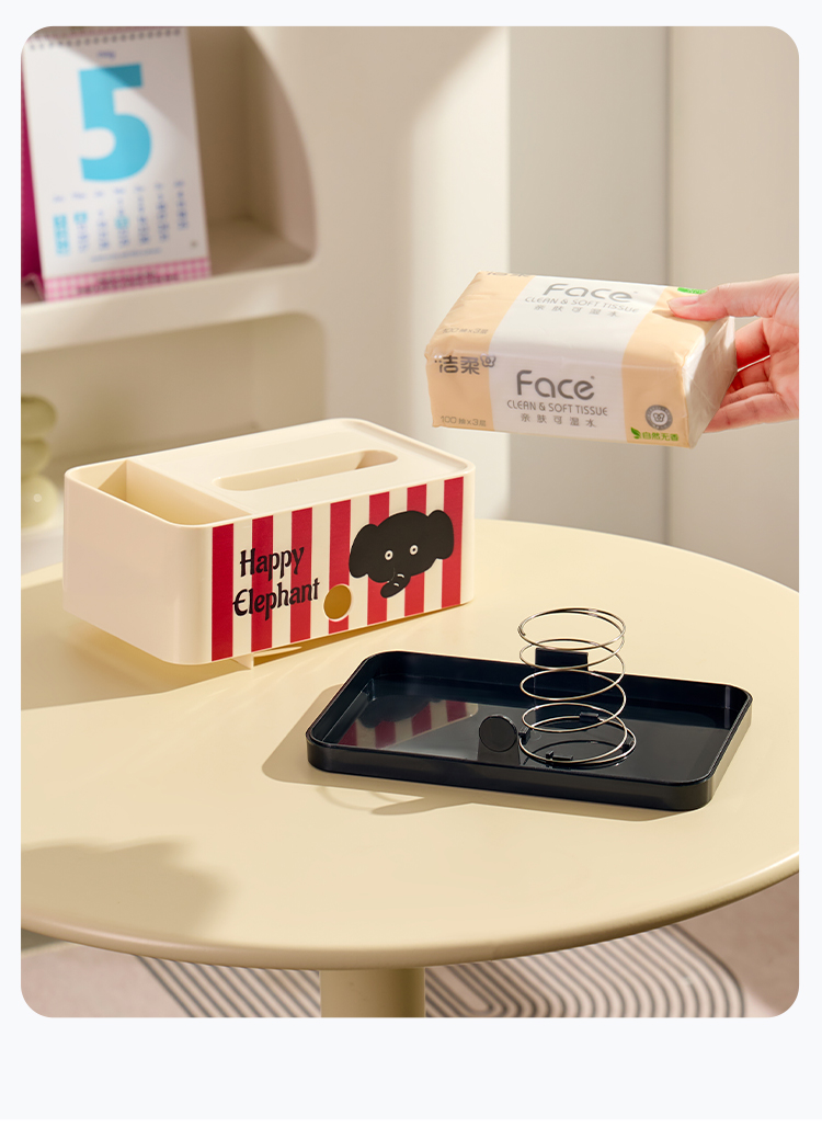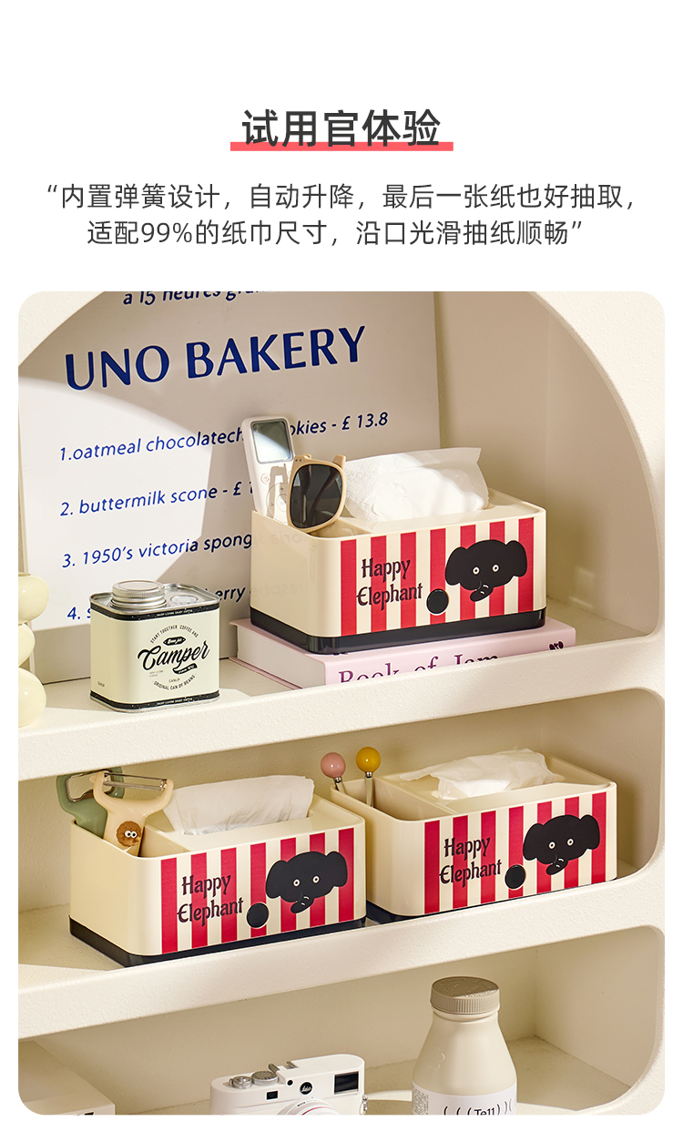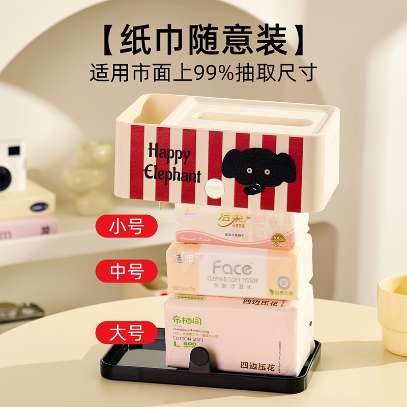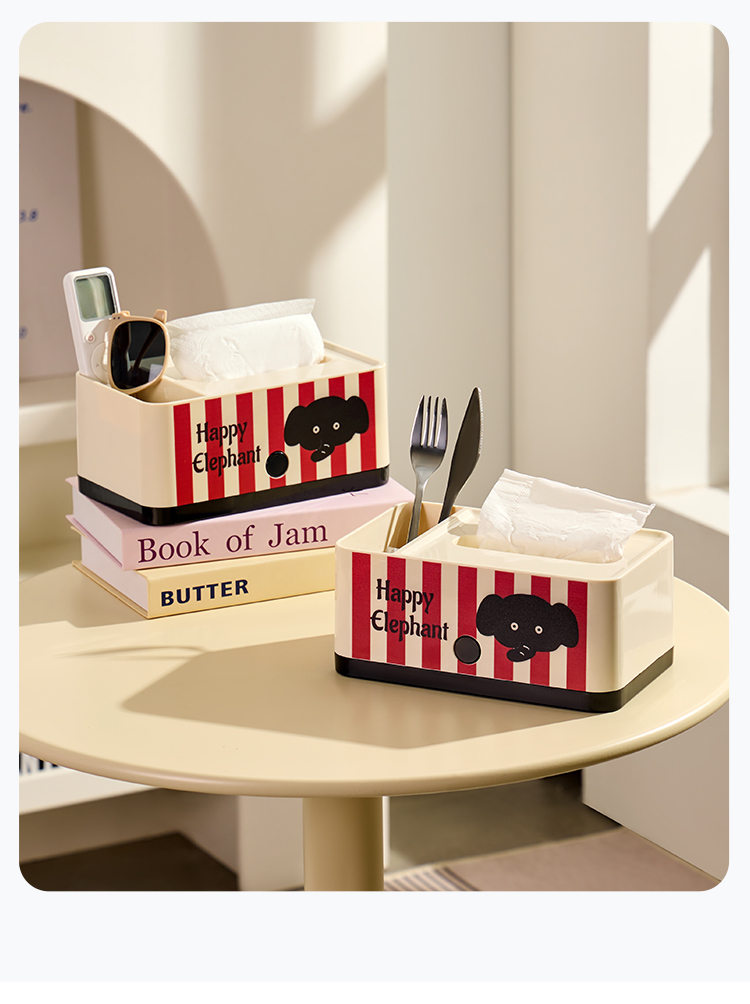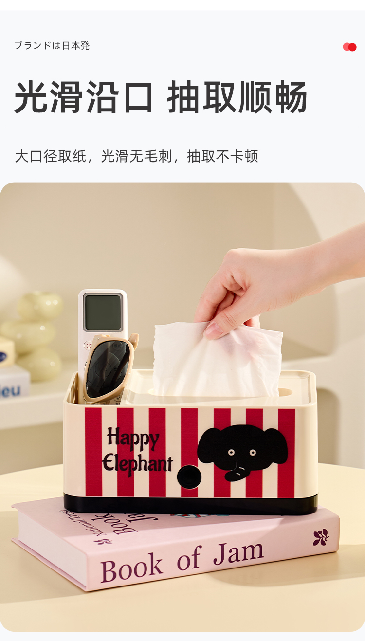 商品名称: 卡通大象弹簧升降纸巾盒 带侧置物格遥控器架--奶油色+黑色