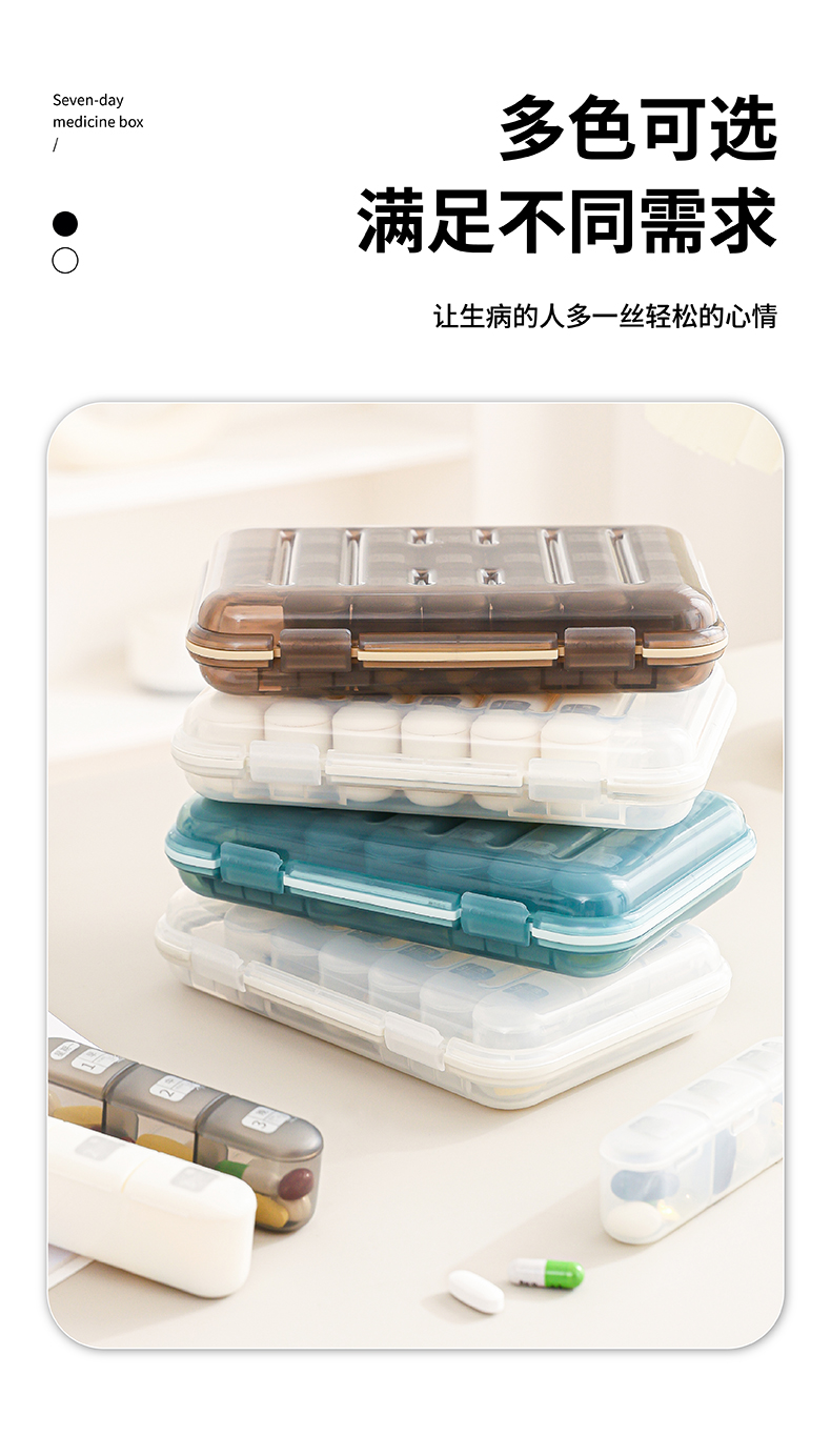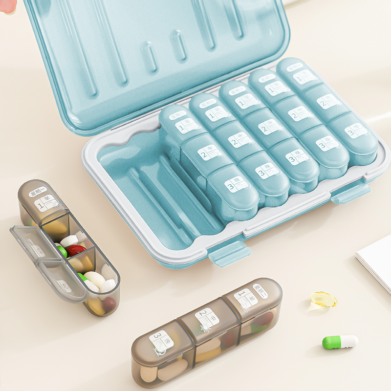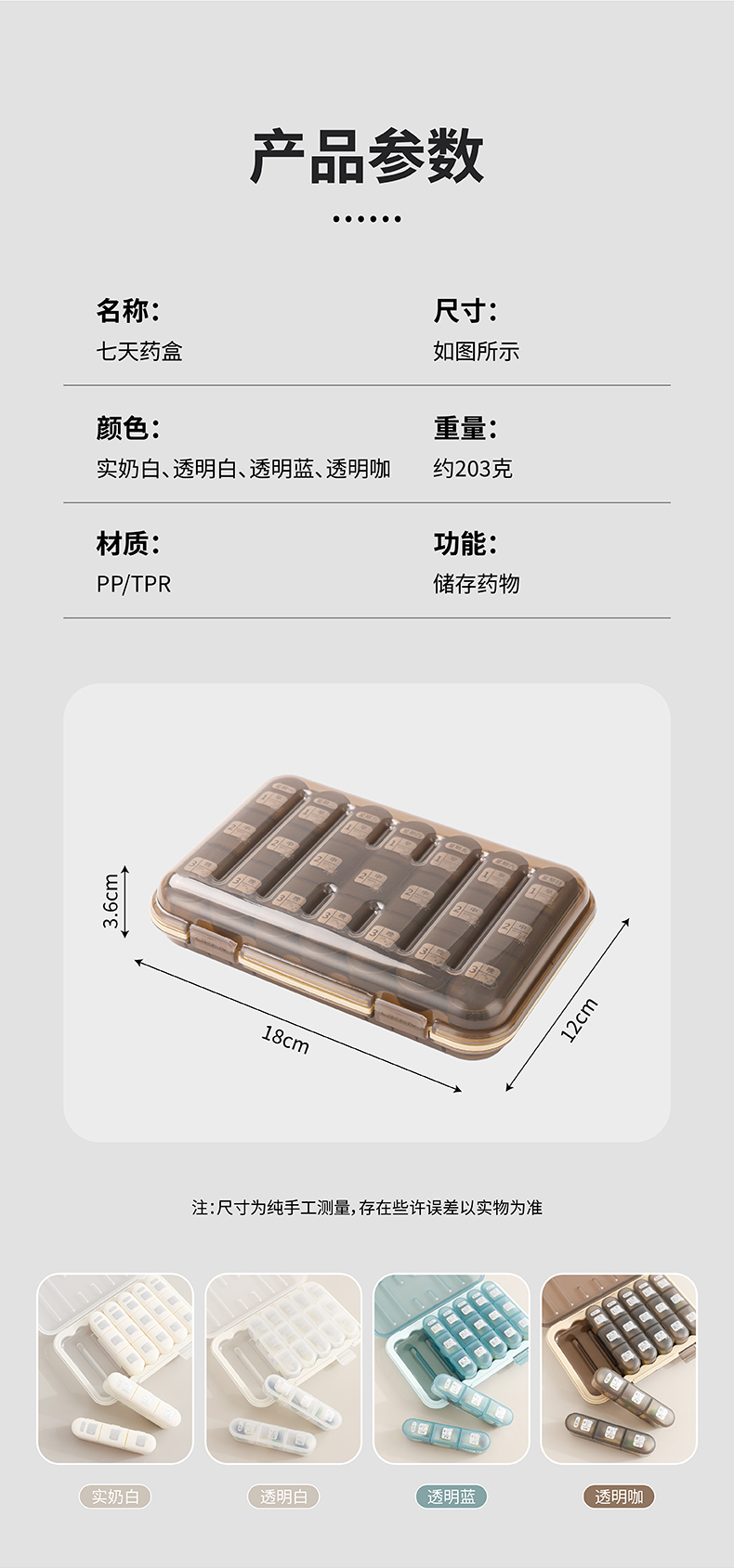 • 商品名称:7天便携式密封药盒 加大图文21小分格大容量药盒--透明蓝