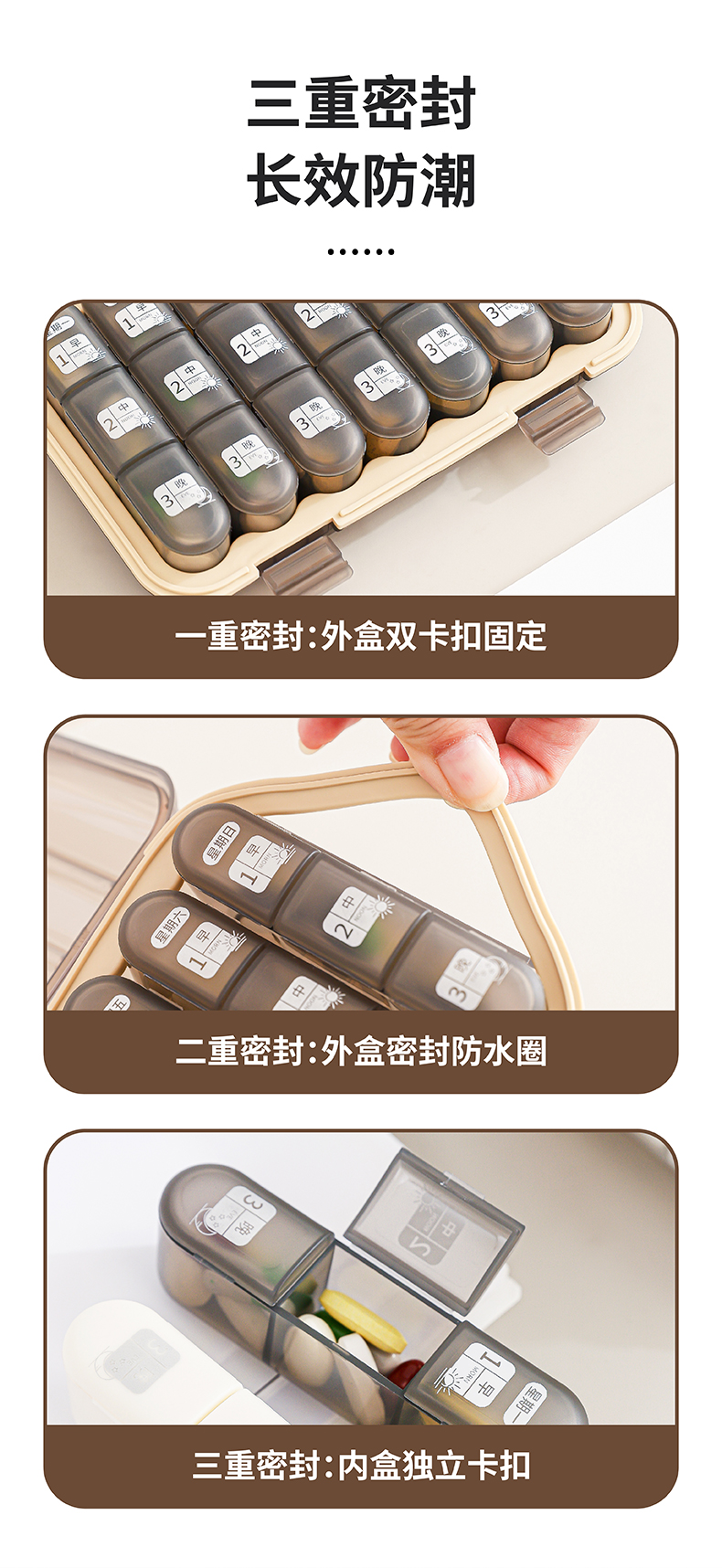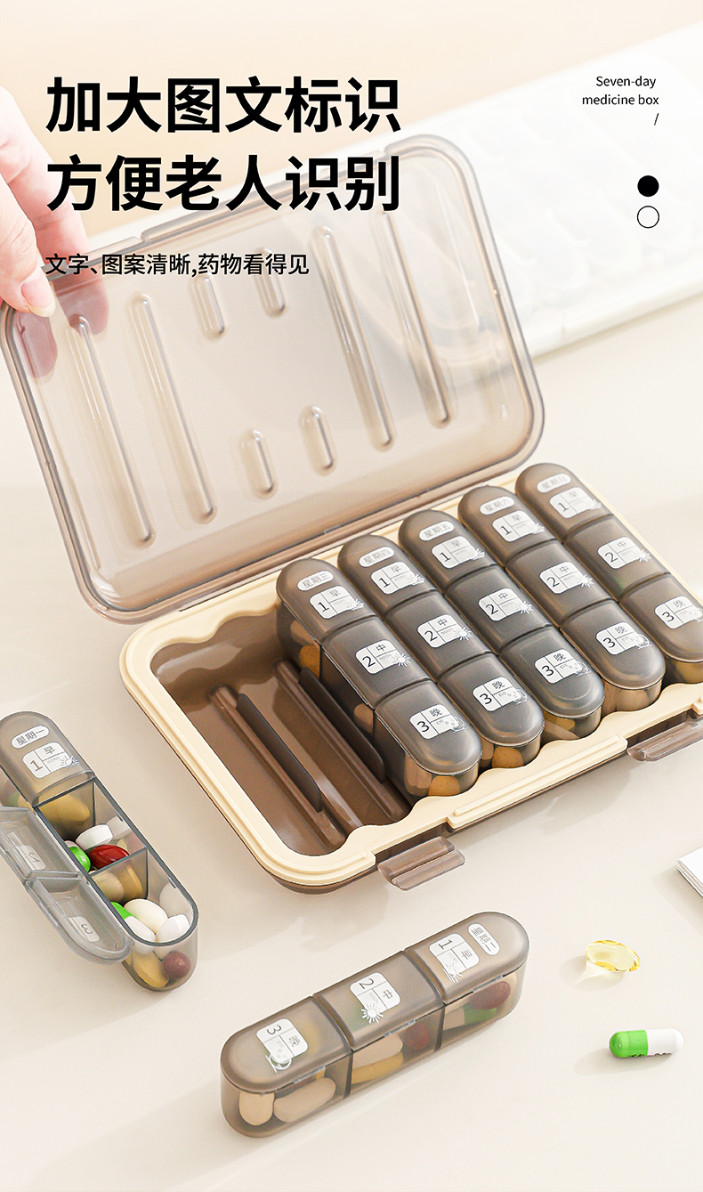 HQS-223797 7天便携式密封药盒 加大图文21小分格大容量药盒--透明咖 24 7.90