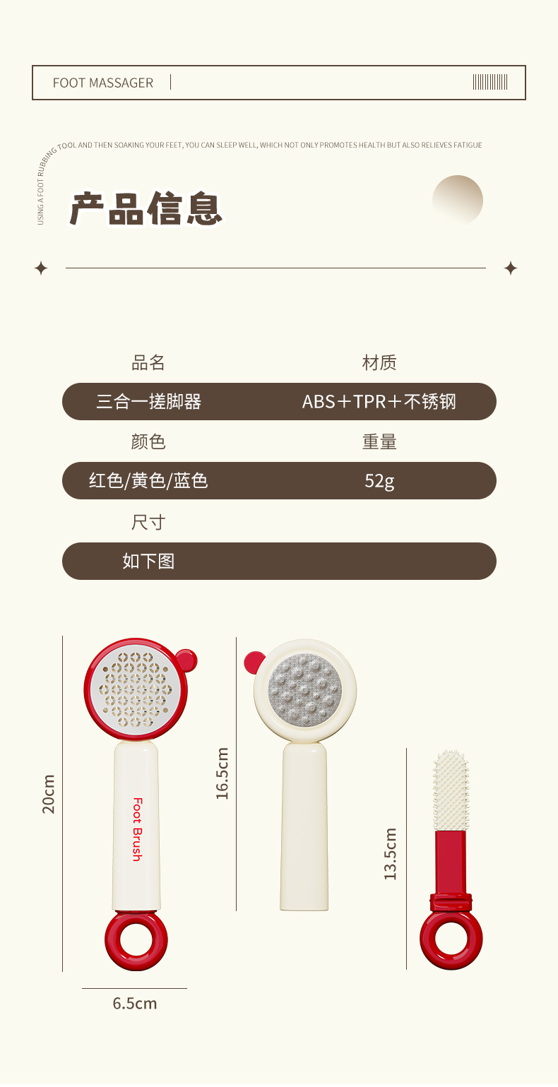 商品名称: 三合一搓脚刷 家用洗脚刷脚趾缝清洁刷--红色
