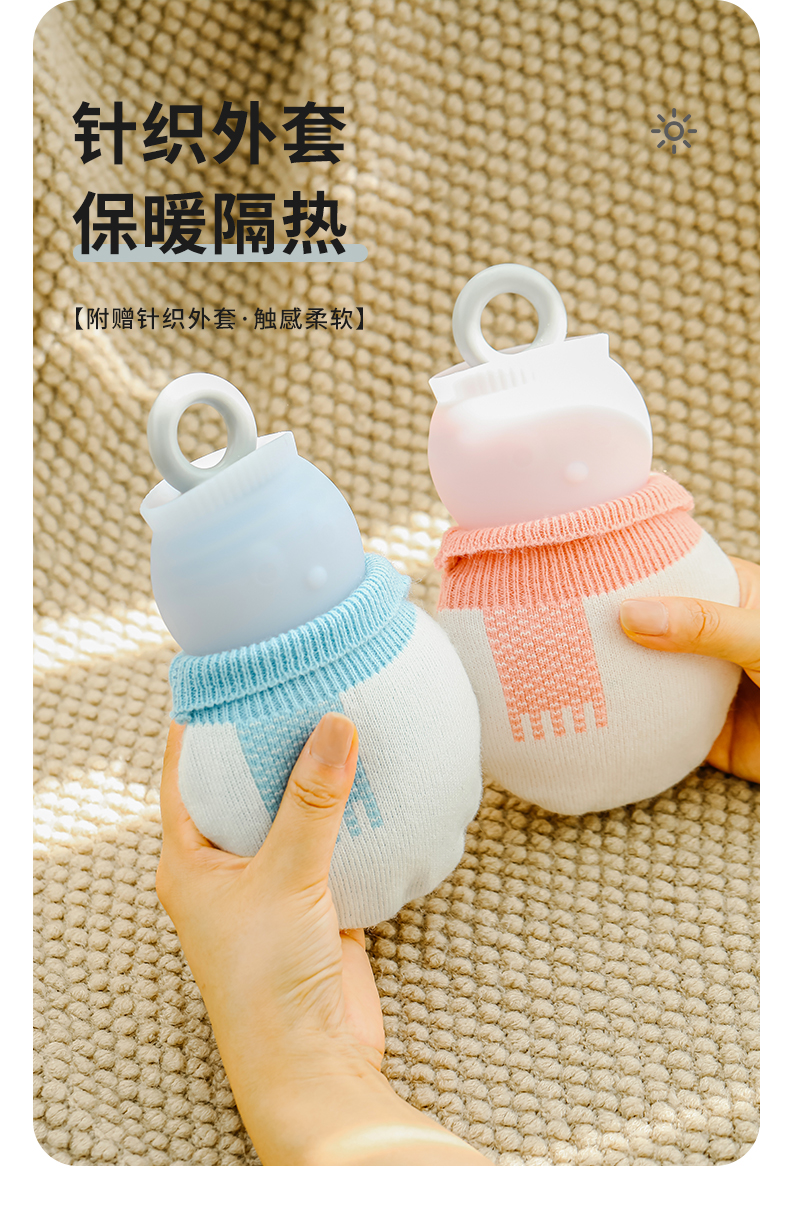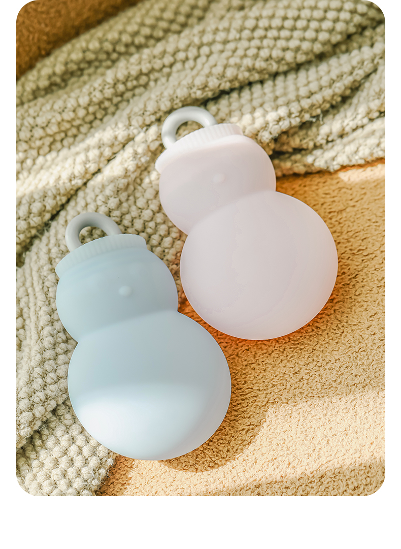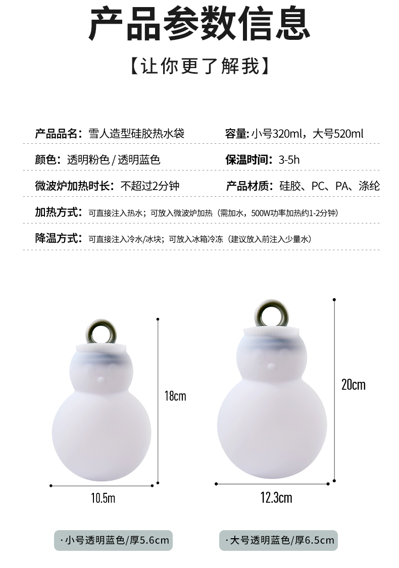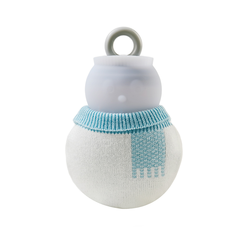 • 商品名称:萌趣雪人硅胶热水袋 带针织外套冷热两用可微波加热 大号--透明蓝色