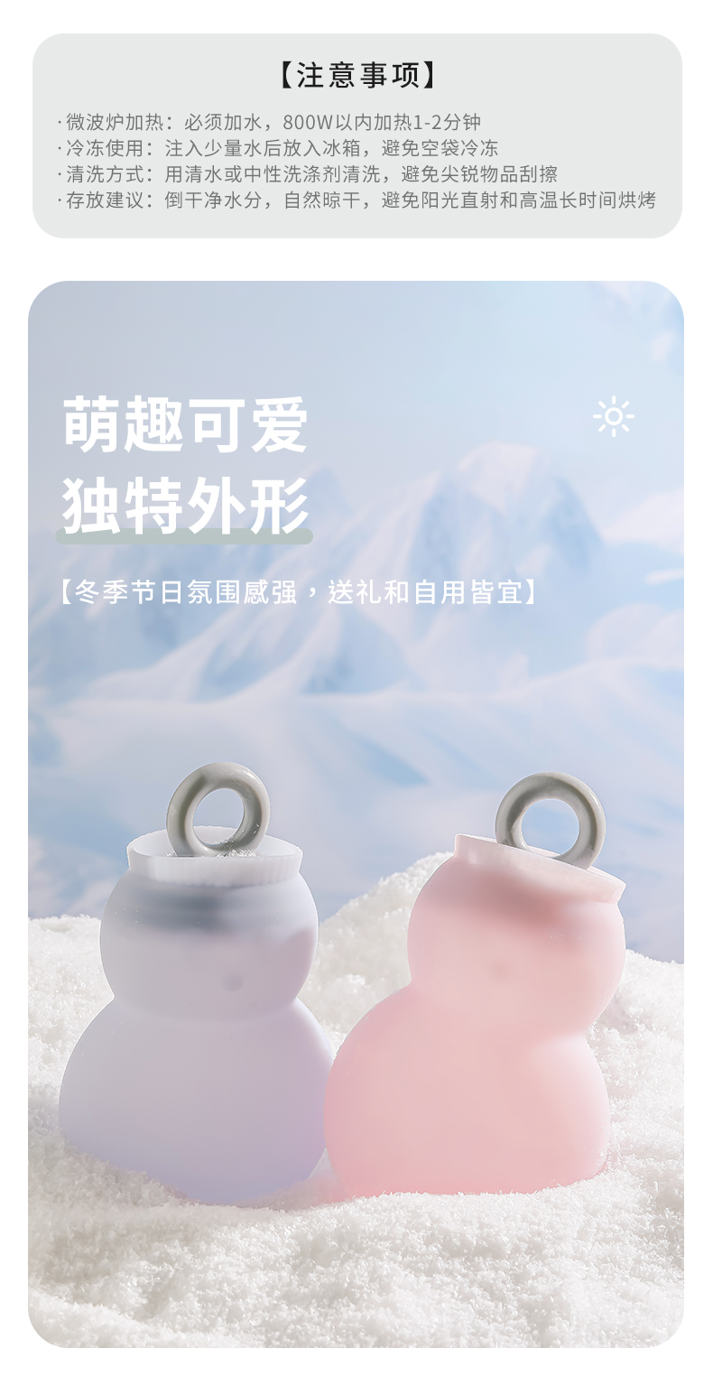 HQS-223828 萌趣雪人硅胶热水袋 带针织外套冷热两用可微波加热 大号--透明蓝色 30 登录查看