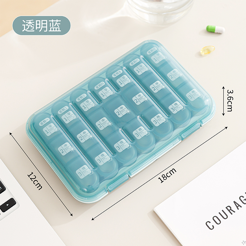 7天便携式密封药盒 加大图文21小分格大容量药盒--透明蓝